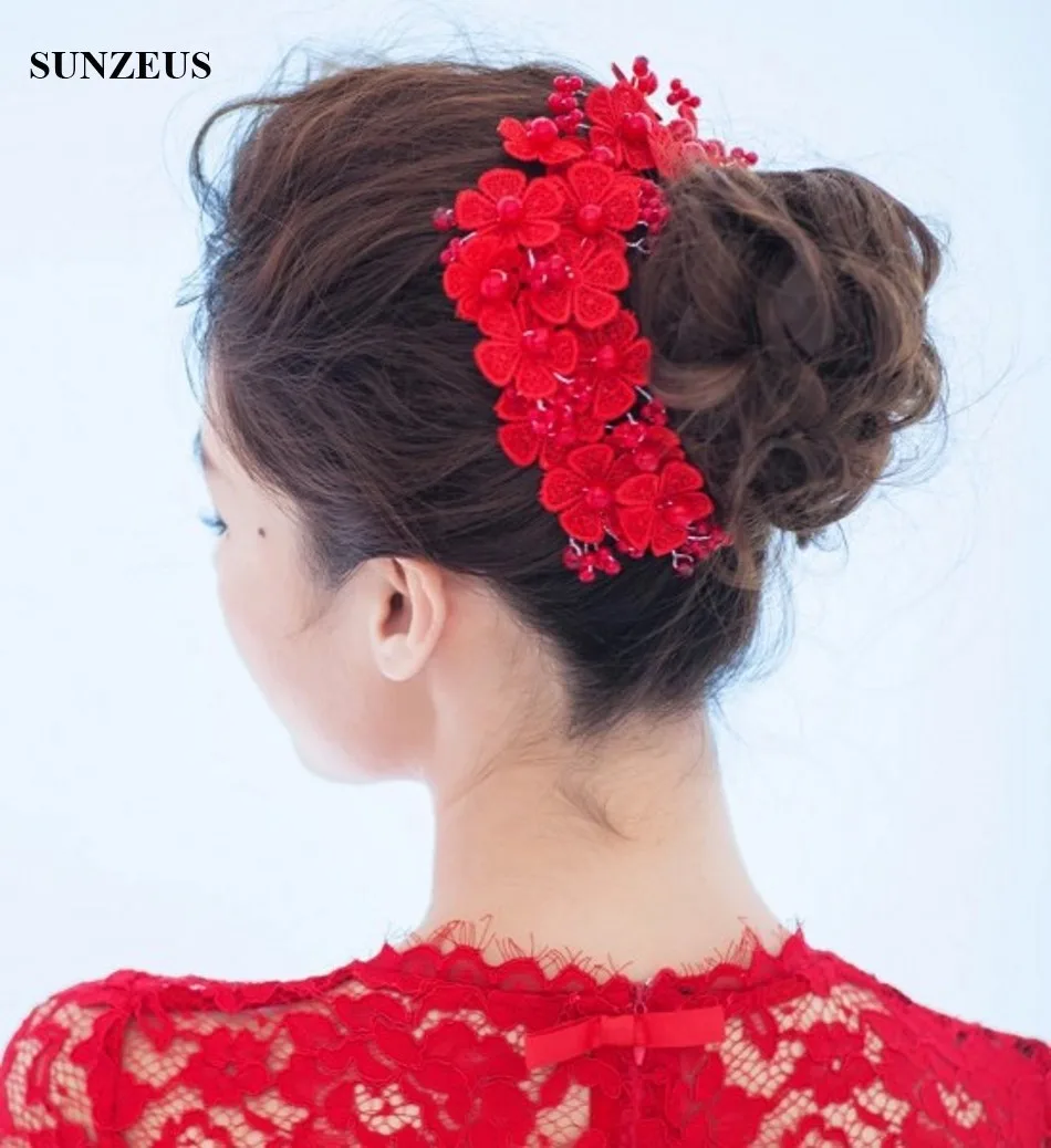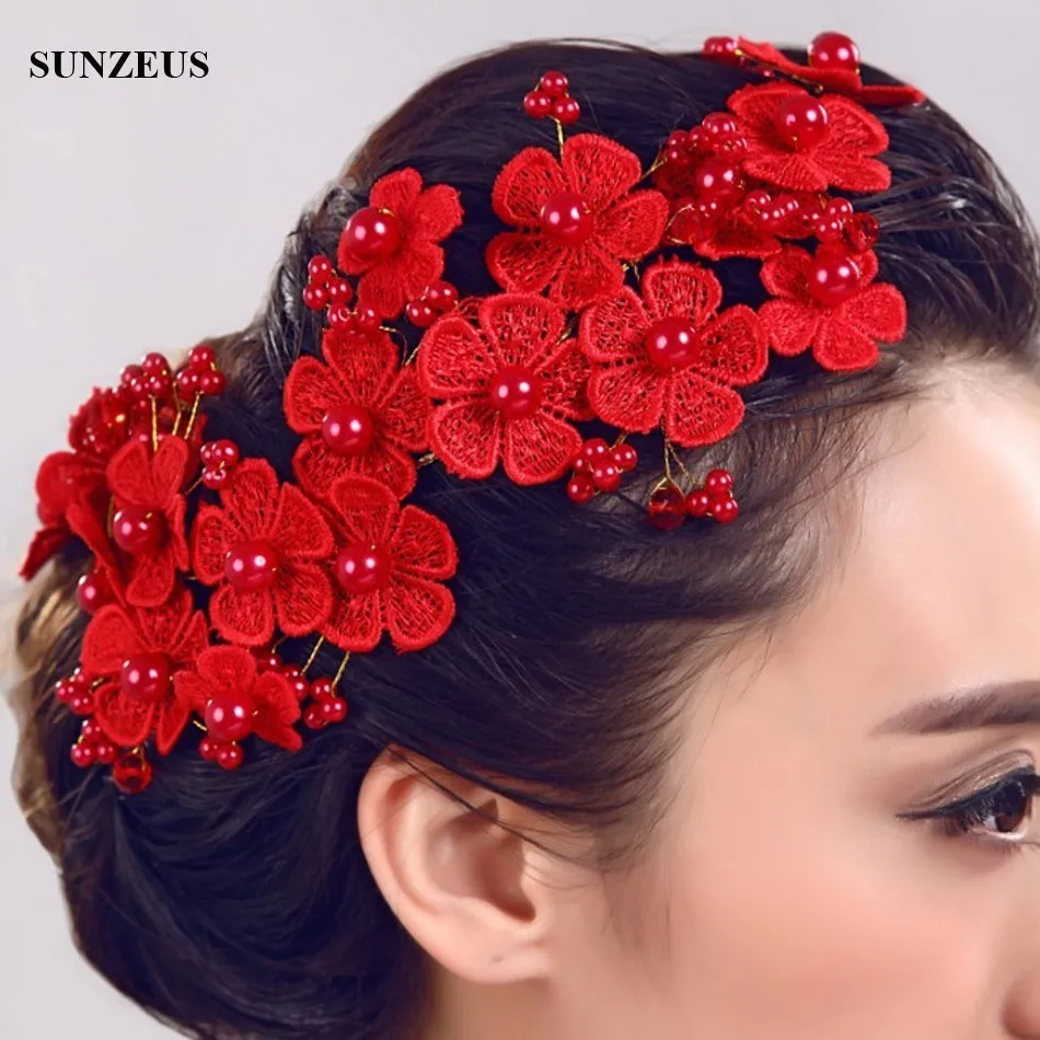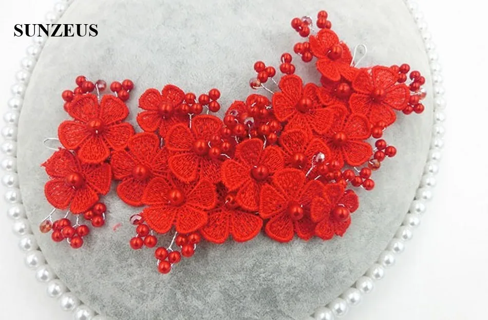 Beautiful Red Bridal Headband Lace Pearls Red Flowers Headpieces Wedding Accessories SQ0204